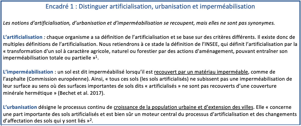 À l’issue des débats parlementaires de la loi Climat et résilience, les législateurs ont retenu une définition complexe de l’artificialisation : « L’artificialisation est définie comme l’altération durable de tout ou partie des fonctions écologiques d’un sol, en particulier de ses fonctions biologiques, hydriques et climatiques, ainsi que de son potentiel agronomique par son occupation ou son usage » (article 192). Puis, il est précisé qu’au sein des documents d’urbanisme, est considérée comme artificialisée « une surface dont les sols sont soit imperméabilisés en raison du bâti ou d’un revêtement, soit stabilisés et compactés, soit constitués de matériaux composites ». A l’inverse, est considérée « non artificialisée une surface naturelle, nue ou couverte d’eau, soit végétalisée, constituant un habitat naturel ou utilisée à usage de cultures. » Cette définition retenue par la loi se distingue des différentes définitions proposées dans la littérature grise (INSEE, CEREMA, Ministère de la transition écologique et solidaire).