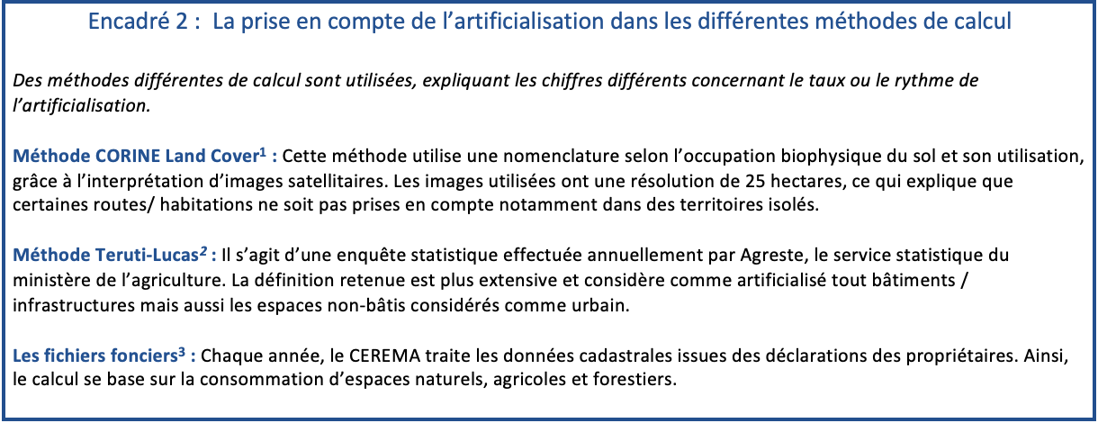 Tout d’abord, il faut souligner que selon les définitions et les méthodes retenues, les chiffres de l’artificialisation en France varient. Si on se fonde sur les données de la méthode CORINE Land Cover, interprétant des données satellitaires, 5,5 % du territoire français est artificialisé. Si on retient les données de l’enquête Teruti-Lucas, qui repose sur une méthode d’extrapolation sur un échantillon de parcelle, ce chiffre monte à 10 %. Enfin, les fichiers fonciers, qui permettent de voir les changements d’usage des sols, estiment ce chiffre à 7,1 % (Fosse, 2019). Le rythme d’artificialisation varie entre 16 000 hectares par an, selon CORINE Land Cover, et 60 000 hectares par an, selon Teruti-Lucas.
