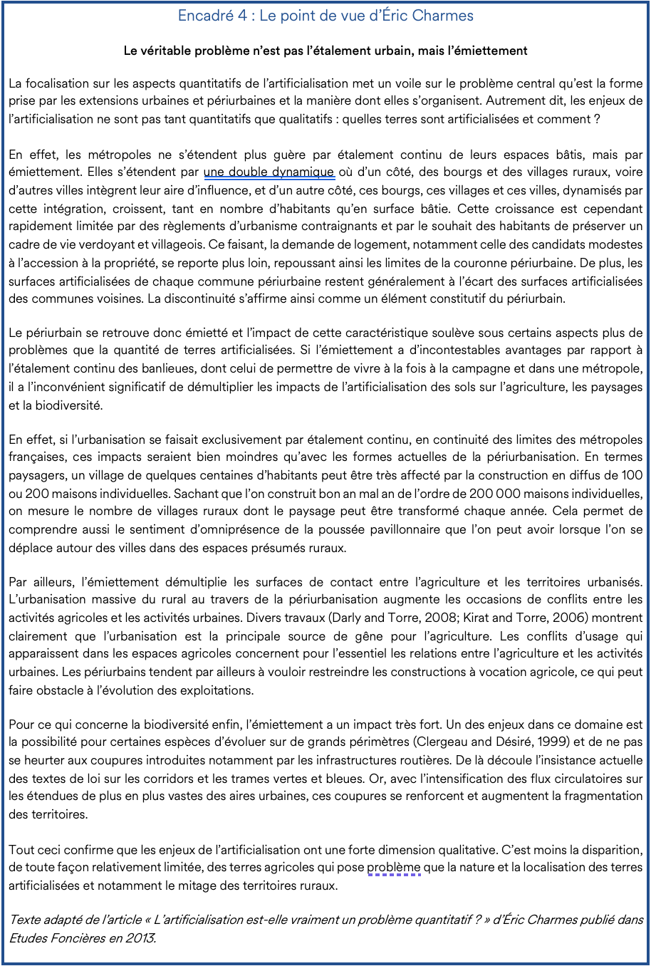 Cette définition complexe de l’artificialisation des sols constitue une avancée pour la plupart des personnes auditionnées mais présente des difficultés de mise en œuvre opérationnelle à court terme. C’est la raison pour laquelle la loi précise à l’article 194 : « Pour la première tranche de dix années, le rythme d’artificialisation est traduit par un objectif de réduction de la consommation des espaces naturels, agricoles et forestiers par rapport à la consommation réelle de ces espaces observée au cours des dix années précédentes ». De son côté, Éric CHARMES (cf. encadré 3) rappelle l’importance de l’aspect qualitatif dans l’analyse de l’artificialisation. Ces impacts sont, en effet, beaucoup plus importants lorsque les extensions sont effectuées en mitage plutôt qu’en continuité urbaine.