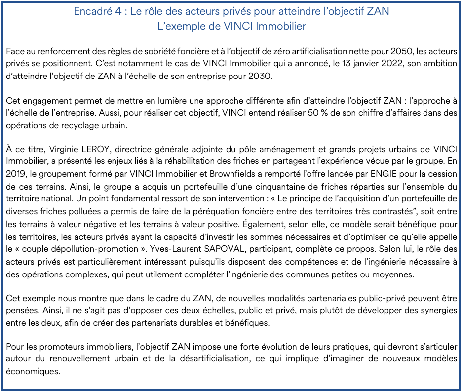 Yves-Laurent SAPOVAL précise que ce n’est pas qu’une affaire de villes moyennes. Il constate que certains villages ont de fort taux d’artificialisation, mais perdent des habitants à l’intérieur de la structure déjà construite, laissant des logements vacants : « En construisant en extension des villages existants, on prend le risque de « tuer » leur centre au profit de leur périphérie ». Ainsi, il s’agit surtout d’une concurrence des périphéries envers le centre. On constate que cette extension vers la périphérie engendre une perte d’attractivité des centres, ce qui se traduit par des conséquences sociales, environnementales et économiques néfastes34. Sur ce point, en recréant de la tension foncière, le ZAN apporte une réponse à cette concurrence exercée par la périphérie et constitue une opportunité afin de maitriser l’étalement urbain. En ce sens, il vient en complément des programmes de revitalisation des cœurs de ville tels qu’Action Cœur de Ville et Petites villes de demain, bénéficiant respectivement à 222 collectivités et 1600 communes35.
