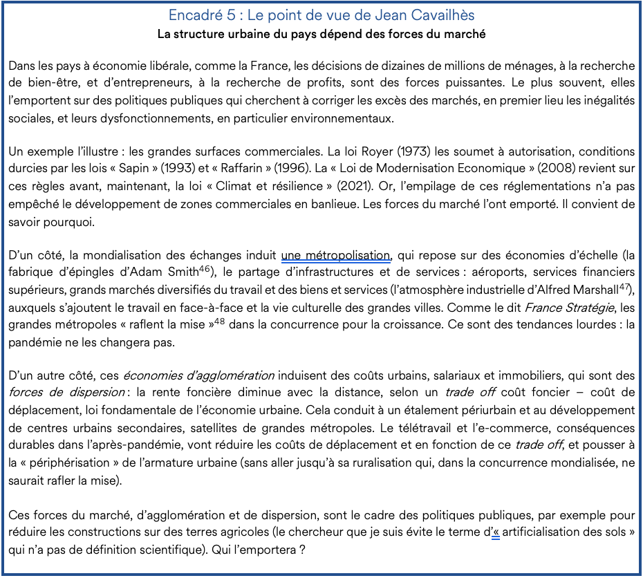 Dans sa contribution, Jean Cavailhès rappelle à juste titre que « la structure urbaine du pays dépend des forces du marché » (cf. encadré 5). C’est vrai dans une économie de marché, particulièrement libérale. Toutefois, les forces du marché dépendent elles-mêmes du cadre institutionnel émanant des politiques publiques. C’est particulièrement le cas du marché foncier, où la valeur d’un terrain dépend d’abord de la valeur des droits sur ce terrain (type d’usage, droits à construire éventuels, etc.) qui sont créés par les pouvoirs publics dans les documents d’urbanisme. En creux, l’objectif ZAN peut être interprété comme le signe d’une page libérale de l’aménagement du territoire qui est en train de se tourner. Plus fondamentalement, c’est une invitation à élaborer une nouvelle vision stratégique de l’aménagement du territoire sur plusieurs générations, comme ont su le faire nos ainés après la Seconde Guerre mondiale. Dans une récente tribune, Pierre Veltz et David Djaïz ne disaient pas autre chose en appelant de leurs vœux à « revenir à une forme de planification stratégique et spatiale »6.