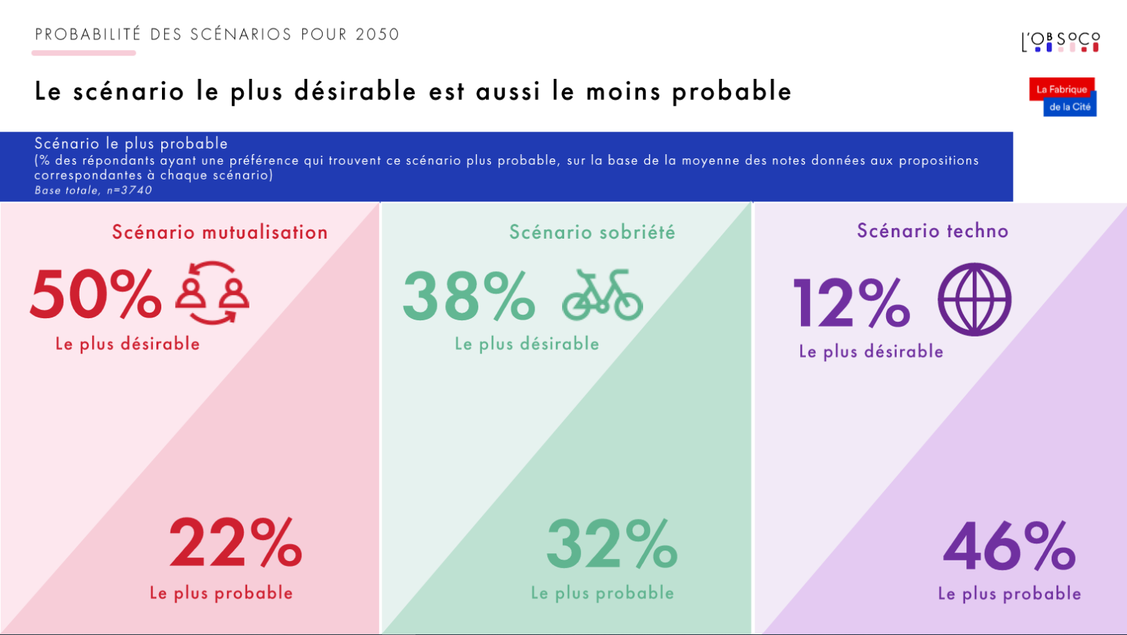 Plonger dans les aspirations des Français a permis de déceler leur potentiel d’adhésion à trois grands scénarios, eux-mêmes matérialisés sous forme de 12 propositions par scénario (36 au total).