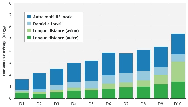 Il existe des disparités de consommation et d’usages entre centre, banlieue et périphéries des villes. Le graphique 3 illustre les inégalités d’émissions liées au transport par décile de niveau de vie et localisation. Ce graphique montre qu’un ménage très aisé en milieu urbain (D10 Centre) peut avoir des émissions carbones équivalentes à un ménage de la classe moyenne en milieu rural (D6 Rural). Par ailleurs, si seulement 35 % des ménages ruraux et 38 % des ménages de banlieue émettent moins de 1 tCO2 par an pour leur transport, une majorité d’urbains y parviennent (53%).