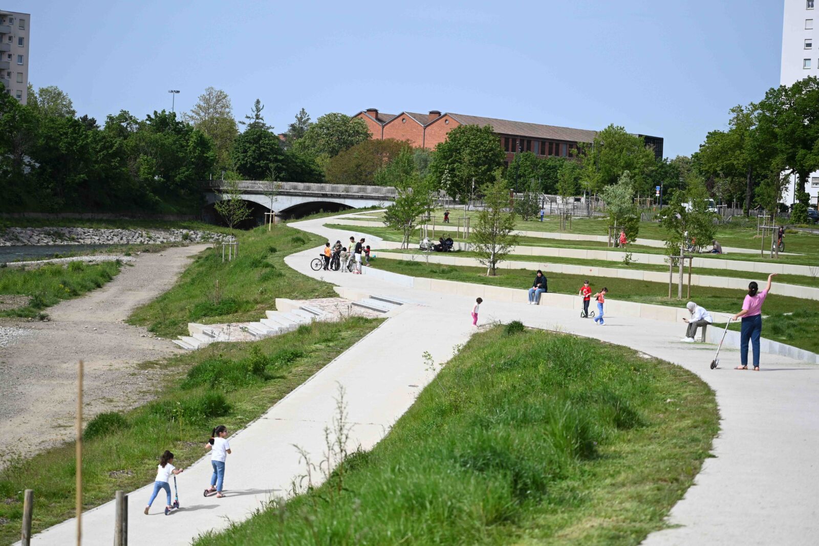 Parmi les caractéristiques de Mulhouse Diagonales, la place importante accordée à la concertation avec les habitants. « Nous avons organisé 66 concertations et 15 réunions publiques pour présenter les objectifs et la philosophie du projet, sans oublier des balades urbaines à différentes heures et périodes de l’année, de façon à rencontrer tous les types d’usagers », explique Claudine Boni da Silva, adjointe au maire de Mulhouse en charge des mobilités et déplacements doux. Menée avec le soutien de l’Agence de la participation citoyenne de la ville, cette concertation, d’un coût d’un million d’euros, a enrichi les projets et conduit à la construction de nouveaux équipements, tels qu’une guinguette au bord de l’eau, un mur d’expression artistique ou encore plusieurs aires de jeux9.