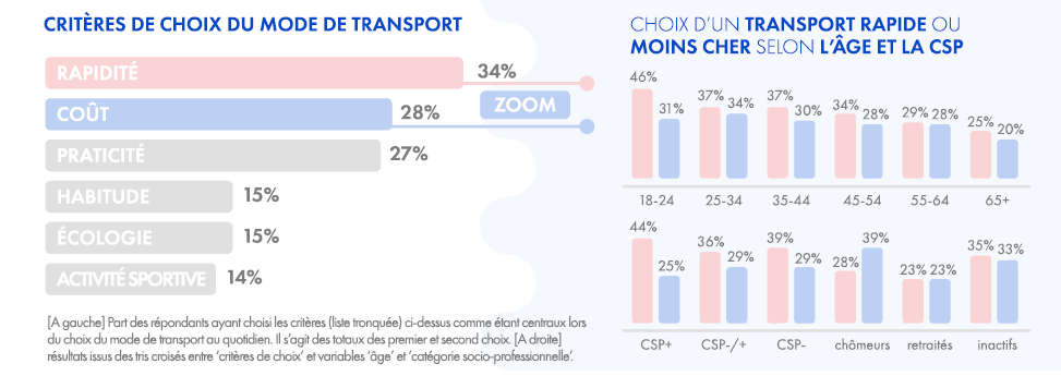 Dans l’ensemble, les Français valorisent la rapidité (34 % des répondants considèrent ce critère comme prioritaire), les modes de déplacements les moins coûteux (28 %), leur praticité (27 %)14.