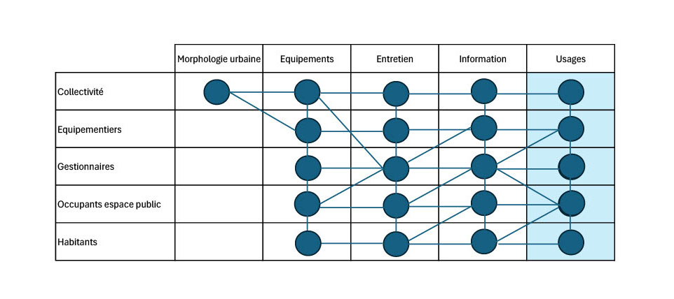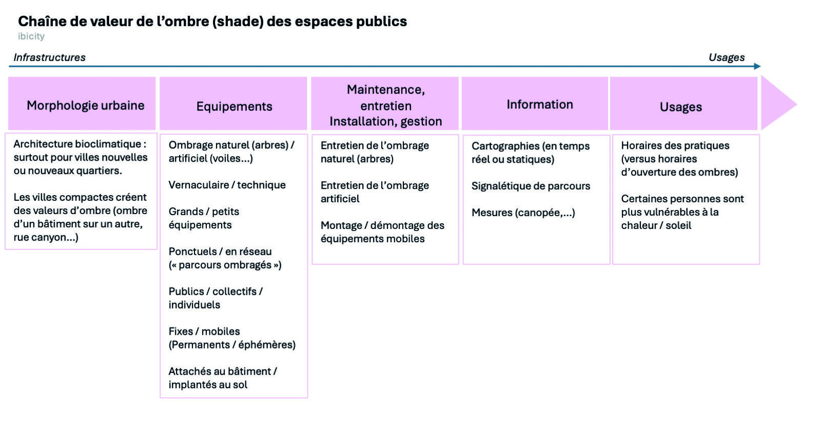 On ne peut pas fabriquer le soleil, mais on peut fabriquer l’ombre, et celle-ci a une forte dimension matérielle. La fourniture de l’ombre se décompose en plusieurs étapes : sa fabrique (morphologie urbaine et équipements), son entretien, sa couche informationnelle et ses usages.