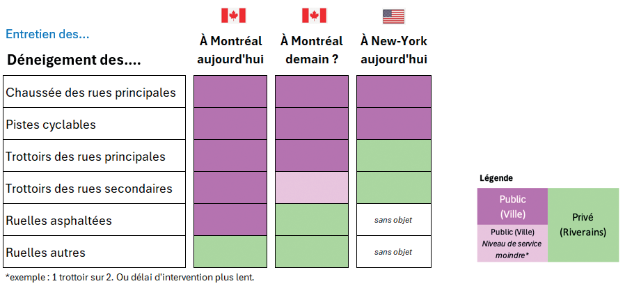 Le déneigement à Montréal est un service essentiel dont les modalités de délivrance ont évolué dans le temps. Au XIXème siècle, le déneigement était de la responsabilité des riverains (comme il l’est d’ailleurs toujours dans beaucoup d’autres villes) et ce n’est qu’à partir de 1905 que la municipalité a décidé de le prendre en charge (la particularité du déneigement à Montréal est que son centre-ville est dense, qu’il y a donc peu de place pour mettre la neige, qu’il fait trop froid pour la laisser fondre. La neige est donc déplacée vers des décharges à l’extérieur de la ville). Or, le réchauffement climatique crée des effets de gel-dégel qui rendent le déneigement des trottoirs beaucoup plus coûteux alors même que les finances municipales sont très contraintes. Dans ce contexte, on a assisté en février 2024 (lors du deuxième hiver le plus chaud au Québec depuis qu’on y mesure les températures) à une politisation de la neige : si on ne peut pas déneiger à la fois les trottoirs, les pistes cyclables et la chaussée, ou s’il ne faut peut-être pas déneiger/entretenir tous les jours, c’est parce que cela coûte cher et que des arbitrages s’imposent. Le mot « déneiger » peut être remplacé par « entretenir ». Quelle doit être la « proposition de valeur », ou les finalités, d’une politique [d’entretien] ? À qui s’adresse-t-elle en priorité ? Comment se met-elle en œuvre ? Avec quels acteurs ? Avec quels coûts et quelles ressources ? La simple observation des trottoirs de Montréal et, par exemple, de ceux de New York, permet de distinguer ceux qui sont [entretenus] par la collectivité et ceux qui le sont par les riverains : à Montréal, [l’entretien], qui est de la responsabilité de la commune, est homogène, tandis qu’à New York, où il incombe aux riverains, le bout de trottoir devant une maison n’est pas [entretenu] de la même manière que le bout de trottoir d’à côté.