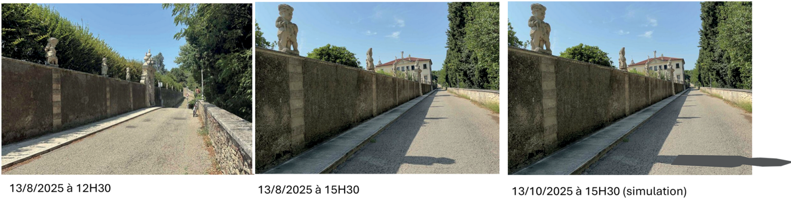 [3] L’anglais utilise deux mots pour traduire l’ombre : shade désigne la zone à l’abri du soleil, shadow la forme projetée sur une surface quand une personne ou un objet se tient entre cette surface et une source de lumière. Photo de gauche : le 12 septembre 2025 à 9h00, depuis un bureau situé dans le pilier sud de La Grande Arche. La Grande Arche de La Défense sert souvent de shade, mais étant un monument protégé par le droit d’auteur, il a été choisi de ne pas reproduire de photo ici. Lire aussi le passionnant et éclectique La découverte de l’ombre, de Roberto Casati (Le livre de poche, 2002).