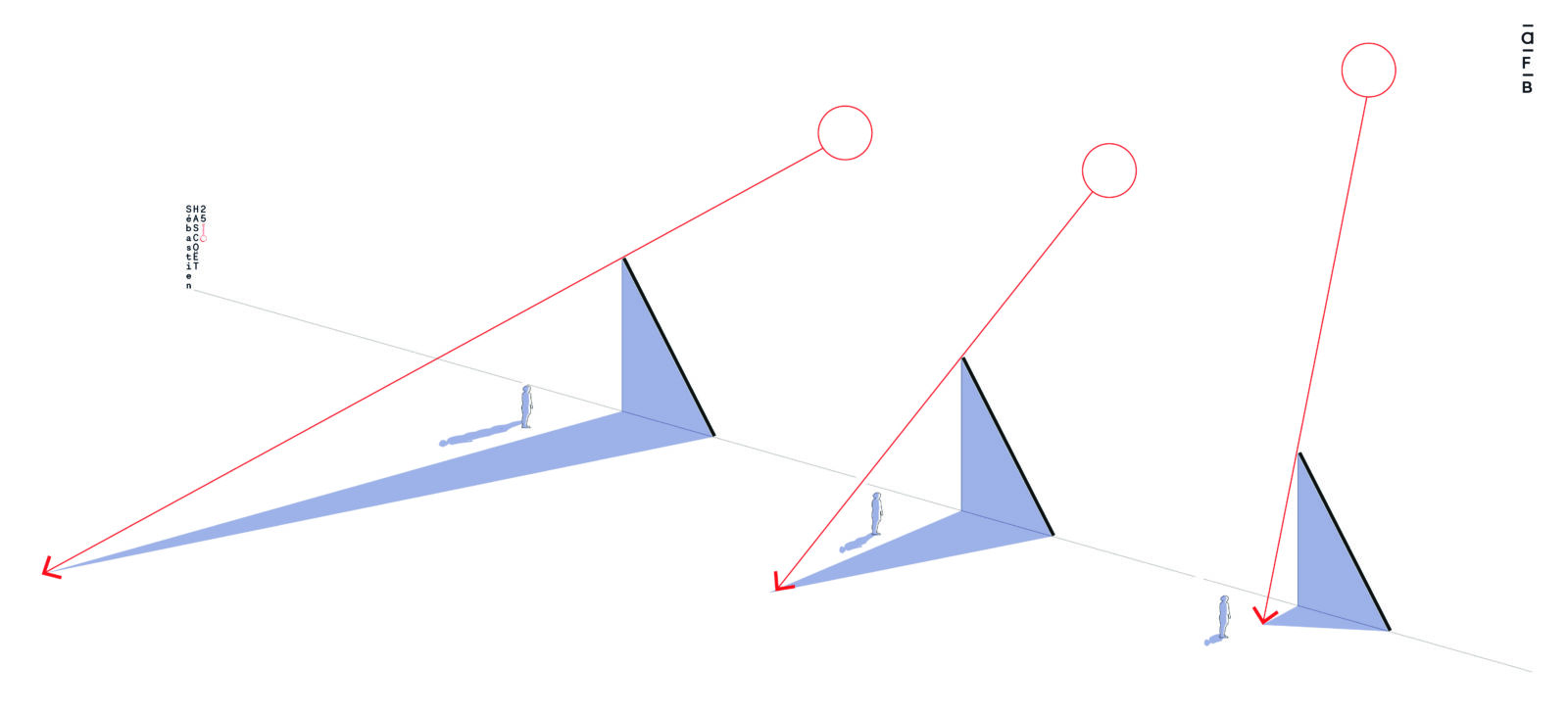 Dans les projets urbains, les urbanistes travaillent souvent avec des bureaux d’étude spécialisés pour réaliser des études d’ensoleillement, ou « héliodon », afin d’optimiser l’implantation des bâtiments, en fonction de ce qui est recherché (plus d’ombre, ou au contraire plus d’apports solaires pour chauffer les bâtiments bioclimatiques par exemple). L’étude des ombres portées peut aussi tenir compte des « masques lointains » des montagnes. Dans tous les cas, plus il fait chaud, plus la valeur de l’ombre augmente.