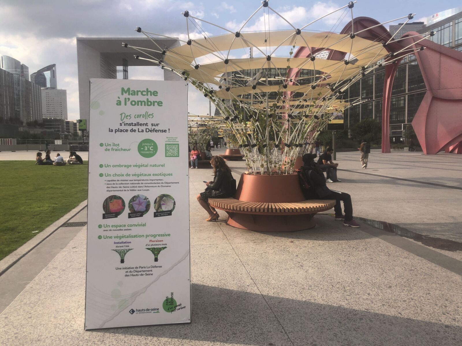 Les arbres sont l’une des premières sources d’ombre dans l’espace public. Lorsqu’ils sont bien développés, ils sont particulièrement efficaces pour rafraîchir les villes car en plus d’occulter le soleil, ils rafraîchissent l’air ambiant par évapotranspiration. L’impact des arbres est d’autant plus flagrant en plein soleil : la température mesurée est 7 °C plus faible sous les arbres à 13 heures 23. Mais parfois, les arbres jeunes fournissent peu d’ombrage, ou planter des arbres n’est pas possible du fait des réseaux en sous-sols. Dans ce cas, les équipements artificiels peuvent être particulièrement efficaces.