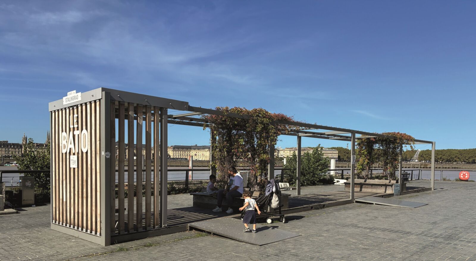 L’ombre se fabrique à différentes échelles, avec des équipements de petite taille et d’autres de grande taille… voire de la taille du Brésil (cf. le projet controversé de la Planetary Sunshade Foundation d’envoyer dans l’espace une ombrelle géante pour refroidir la Terre 26). À Séville, le Metropol Parasol (ou « les champignons de Séville »), inaugurée en 2011, est une immense structure en bois qui crée de l’ombre sur la Plaza de la Encarnación : la structure mesure 150 mètres de long, 75 mètres de large, culmine à 28 mètres de hauteur et couvre une surface de plus d’un hectare (11.000 m²). À Bordeaux, une œuvre d’art monumentale à fonction d’ombrière accompagne la naissance d’un nouveau quartier sur la rive droite. Imaginée par l’artiste Leandro Erlich 27 pour le fonds Cré’Atlantique, La Carte, À l’ombre de la ville est composée de 14 arbres d’aluminium de 5 mètres de haut, recouverts d’une canopée de près de 400 m², imaginée comme une forêt urbaine, et dont l’ensemble forme une interprétation de la carte de Bordeaux. Du mobilier d’ombrage commence aussi à apparaître, comme celui que l’agence AREP conçoit sur les parvis des gares ou les trottoirs des rues alentours 28.
