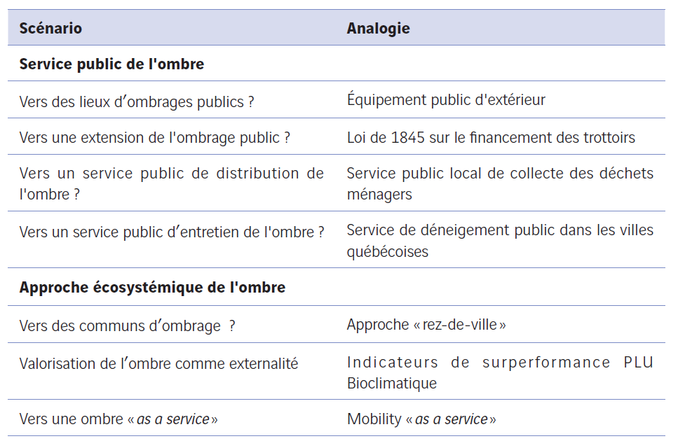 Ne faudrait-il pas alors que l’ombre devienne un service public local, dont précisément un des trois fondements est le principe d’égalité ? Aujourd’hui, la fourniture de l’ombre est tantôt assurée de manière individuelle, tantôt par la collectivité, mais sans qu’une politique de l’ombre soit explicitement énoncée. Nous employons ici le terme de « service public local » dans un sens large, et pas strictement juridique, pour évoquer l’idée que les collectivités locales pourraient davantage s’impliquer dans sa délivrance. Sept scénarios sont évoqués ici de manière exploratoire, avec pour ambition d’inviter les élus à s’en saisir. Comment un service de fourniture de l’ombre pourrait-il être mis en œuvre ? Les quatre premiers scénarios sont des scénarios où la collectivité est en charge de la fourniture d’ombre, selon des modalités qui varient. Les trois scénarios suivants sont davantage des scénarios de « communs d’ombre », où le rôle de la collectivité est moins de fournir l’ombre que d’organiser sa fourniture par un mixte entre collectivités, opérateurs privés et individus. Ces scénarios ont une visée avant tout heuristique.