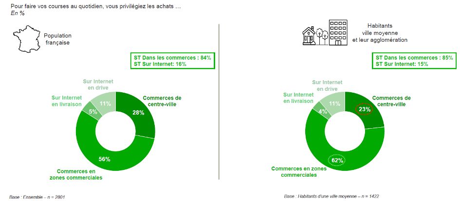 Le deuxième levier d’action est celui du commerce. L’idée selon laquelle le commerce dans les villes moyennes est en crise doit être relativisée, rappelle Philippe Dugot. Les villes moyennes doivent en effet être considérées à l’échelle de l’aire urbaine moyenne, qui est le véritable bassin de vie des habitants, et non à celle du centre. À cette échelle, rares sont les villes à subir une véritable déprise commerciale. Et c’est là que réside le principal enjeu de ces villes moyennes : accepter de détourner le regard du centre-ville pour réussir à soutenir l’ensemble des polarités commerciales de l’aire urbaine moyenne. Même si ces périphéries sont volontiers montrées du doigt, elles font partie du quotidien des Français et remplissent un rôle social et d’accessibilité aux biens de consommation non négligeable. 62% des Français des villes moyennes déclarent ainsi faire leurs courses quotidiennes dans les zones commerciales, et seulement 23% dans les commerces de centre-ville (Fig.10). Citant les écrivains Nicolas Mathieu et Annie Ernaux, Philippe Dugot invite à jeter un regard moins méprisant sur les zones commerciales, lieux d’emploi, d’activité, de sociabilité et de rencontre qui ne sont pas nécessairement de moins bonne qualité qu’une place de centre-ville.