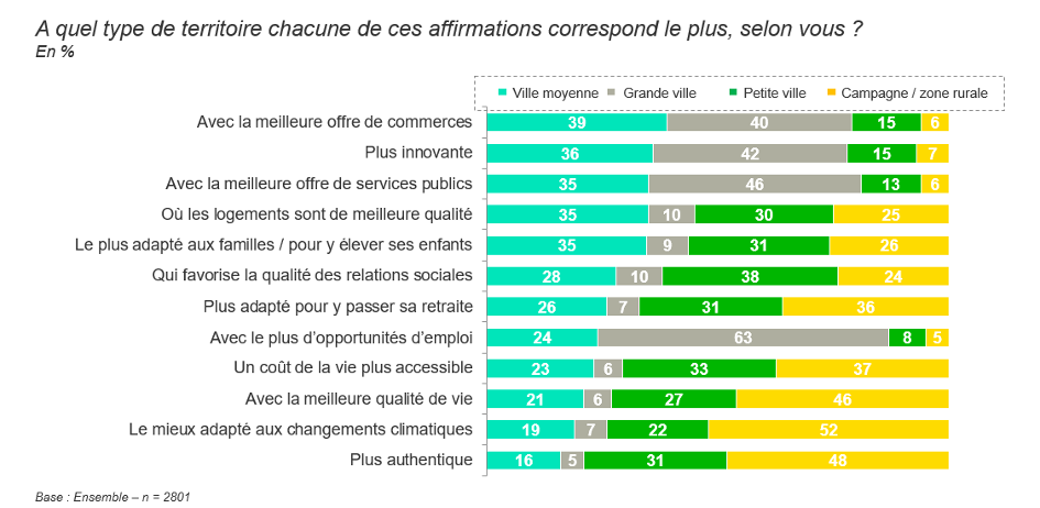 L’authenticité, la capacité d’adaptation au changement climatique, la qualité et le coût de la vie sont des qualités majoritairement associées à la campagne et aux petites villes, considérées comme faisant défaut aux grandes villes. Celles-ci sont en revanche reconnues comme des pôles d’emploi majeurs. Les villes moyennes présentent un profil très équilibré, bénéficiant de toutes les qualités dans des proportions moyennes (Fig.2).