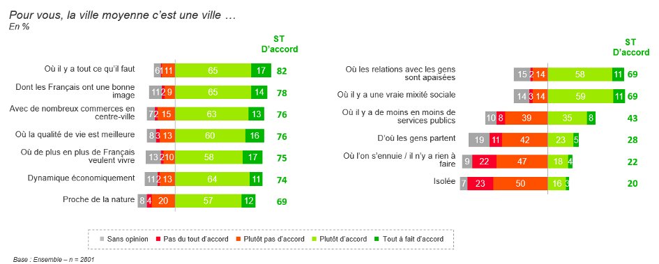 Les villes moyennes sont donc identifiées par les Français comme des lieux dynamiques, attractifs, offrant un bon équilibre entre fonctions de centralité, mixité sociale et cadre de vie agréable et proche de la nature (Fig.3). Alors qu’à la suite de la crise sanitaire, un Français sur cinq déclare vouloir changer de lieu d’habitation, chiffre qui s’élève à un sur trois en région parisienne, les villes moyennes peuvent-elles se présenter comme une alternative plausible ?