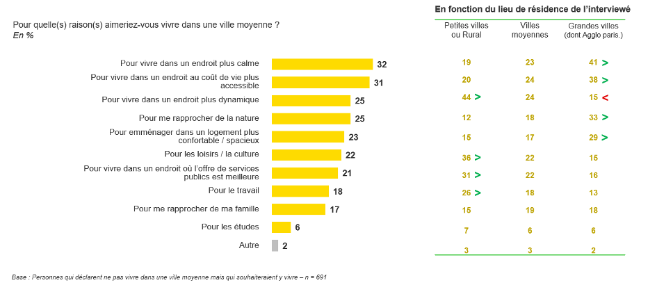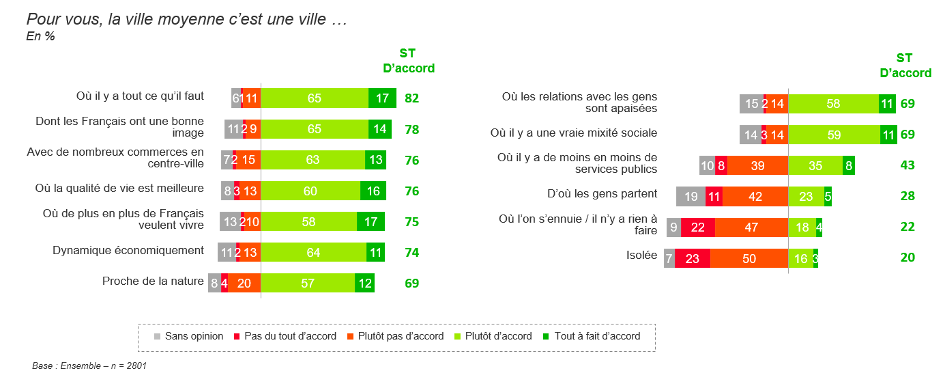 Les villes moyennes font partie de la carte mentale des Français depuis longtemps. Le chercheur Nicolas Rio affirme qu’elles sont « associées à l’enfance, aux vacances ou aux photos de Depardon. […] On a tous en nous un peu de villes moyennes…4 ». La nouveauté que fait apparaître le sondage Kantar/Potloc, c’est le fait d’assumer que les villes moyennes peuvent être une option désirable, sinon plus désirable que les grandes villes et les métropoles pour de nombreux Français, et non un choix par défaut. Emmanuel Rivière explique en effet que « les gens qui habitent les zones les plus urbanisées ont plutôt tendance à vouloir rejoindre la ruralité : il y a un plébiscite pour habiter la campagne, en zone rurale, une sorte d’appel de la nature, d’appel de la forêt, avec une attractivité croissante à mesure que l’on descend dans une échelle de la densité urbaine, avec 40% des gens qui souhaitent habiter en ville moyenne ».