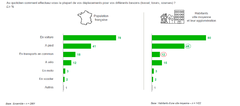 Nous avons fait le choix de distinguer dans ce sondage la ville-centre de ses périphéries. Dans tous les types de villes, quand le choix le leur est donné, les Français préfèrent majoritairement s’installer dans la périphérie, avec ses maisons et jardins, plutôt qu’au centre, avec ses logements plus exigus et plus chers (Fig. 6). Marc-Olivier Padis souligne ainsi que « la ville moyenne est moins vue comme un lieu d’habitation que comme un espace de services ». Cette dynamique soulève toutefois un enjeu territorial fort, celui de réussir à « maîtriser la mobilité quotidienne et la place de la voiture dans toutes ces circulations car la voiture reste prépondérante dans ces modes de vie ». 80% des habitants de villes moyennes (78% à l’échelle nationale) déclarent en effet recourir à leur voiture pour leurs déplacements quotidiens, seuls 12% (18% à l’échelle nationale) déclarent utiliser les transports en commun au quotidien et 48% marchent (41% à l’échelle nationale) (Fig.7).