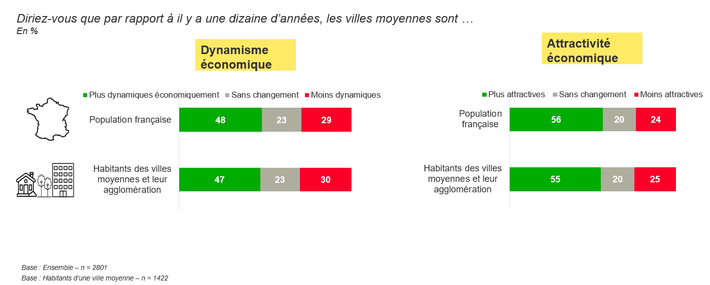 Tout indique que les villes moyennes bénéficient aujourd’hui d’une image plus positive, bien éloignée de celle de prison dont on chercherait à s’échapper à la première occasion. Non seulement les Français associent la ville moyenne à des concepts positifs (offre de services et de commerces, qualité de vie, dynamisme, etc.), mais surtout ils considèrent que cette bonne image est partagée de tous : 78% des répondants déclarent penser que les Français en ont une image positive. Ces villes ne sont donc plus considérées comme porteuses d’un stigmate honteux. Cette image est nourrie d’un sentiment d’inversion de tendance pour les villes moyennes. Les sondés sont seulement 29% à les juger moins dynamiques qu’il y a dix ans et sont 56% à les trouver plus attractives. À Charleville-Mézières, ce sont même deux tiers des habitants qui estiment que leur territoire est plus dynamique qu’il y a dix ans.
