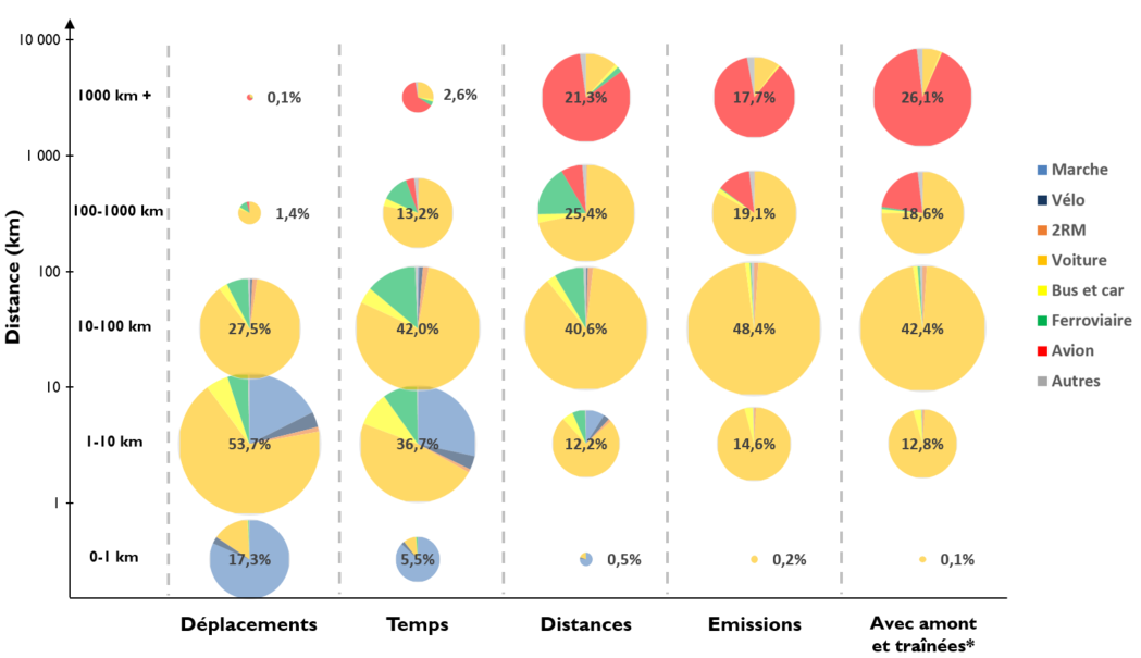Ainsi, les trajets domicile-travail constituant les déplacements les plus longs et les plus structurants du quotidien, il apparaît stratégique de prioriser la décarbonation de ces mobilités et de permettre une réduction de l’usage de la voiture, qui domine tous les modes de transports sur les distances de 1 à 1000 km (voir graphique ci-dessous).