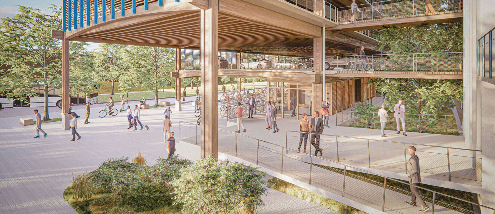 Si l’infrastructure est déclarée fondamentalement nécessaire, le groupe AREP pense sa seconde vie. Concernant les parkings des gares, destinées à être des lieux structurants des SERM, pourquoi ne pas envisager des structures en bois, réversibles, pour que ces lieux puissent stocker du carbone et, un jour, être transformés en logements ou en bureaux ? À Saint-Julien-en-Genevois (74), AREP a ainsi piloté la construction d’un parking en structure en bois réversible.