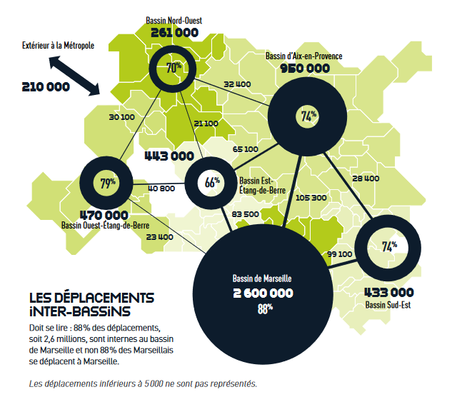 L’étendue et le relief de la métropole Aix-Marseille Provence – 2,5 fois la taille de Paris et 1 911 311 habitants – ont largement favorisé l’usage massif de la voiture et l’étalement urbain. La voiture représente 52 % des déplacements effectués dans la métropole (12 % pour les transports en commun et le vélo). Dans le bassin de mobilité de Marseille, la distance moyenne parcourue pour aller au travail est de 11,5 km ; c’est 17 km dans le bassin d’Aix-en-Provence38. D’après l’enquête Mobilité Certifiée Cerema démarrée en 201939 ¾ des déplacements ont pour destination un des 6 bassins de mobilités de la métropole (bassin de Marseille, bassin d’Aix-en-Provence, bassin Nord- Ouest, bassin Ouest Étang de Berre, bassin Est Étang de Berre et bassin Sud-Est composé de 18 communes dont Aubagne et La Ciotat).