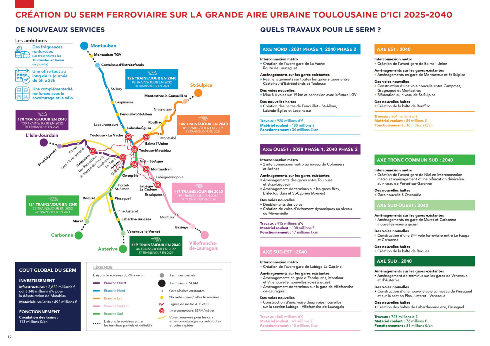Le SERM de Toulouse devrait être le plus grand de France, avec de premières échéances en 2028. En effet, à cette date, les pôles d’échange multimodaux de Colomiers, Montaudran et Labège-La Cadène ainsi que la Halle des transports de Toulouse seront opérationnels et les travaux sur l’axe ferroviaire Colomiers-Brax seront finalisés. En 2031, le réseau sera complété par le pôle d’échange multimodal de La Vache et l’arrivée de la Ligne Grande-Vitesse (LGV) Toulouse-Bordeaux. À terme, ce sont 121 trains supplémentaires prévus d’ici fin 2032 avec un cadencement des trains de 5h à 23h avec des passages toutes les 10 minutes aux heures de pointe et le déploiement de cars à haute fréquence dans les communes où le train ne peut pas se déployer. Les augmentations de lignes de trains devraient se poursuivre jusqu’en 204044.