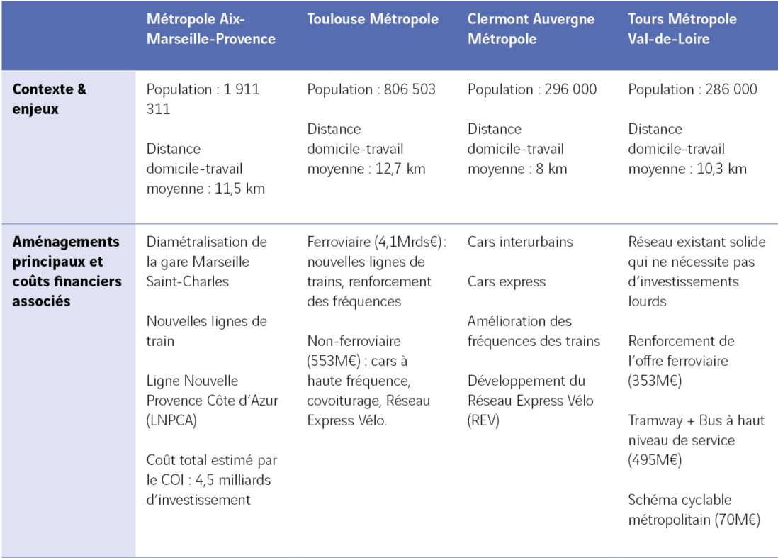 La métropole de Tours comporte 286 000 habitants46 . La voiture représente 52 % des déplacements et les transports en commun et le vélo comptent pour 14 %. La distance moyenne d’un déplacement domicile-travail y est de 10,3 km47. Le ferroviaire y est peu utilisé malgré une étoile à 8 branches, notamment en raison d’un manque de régularité dû à la saturation de la gare. En effet, TER, Intercités et TGV se trouvent fortement concentrés sur deux voies sur une distance de 3 km entre Tours et Saint-Pierre-des-Corps.