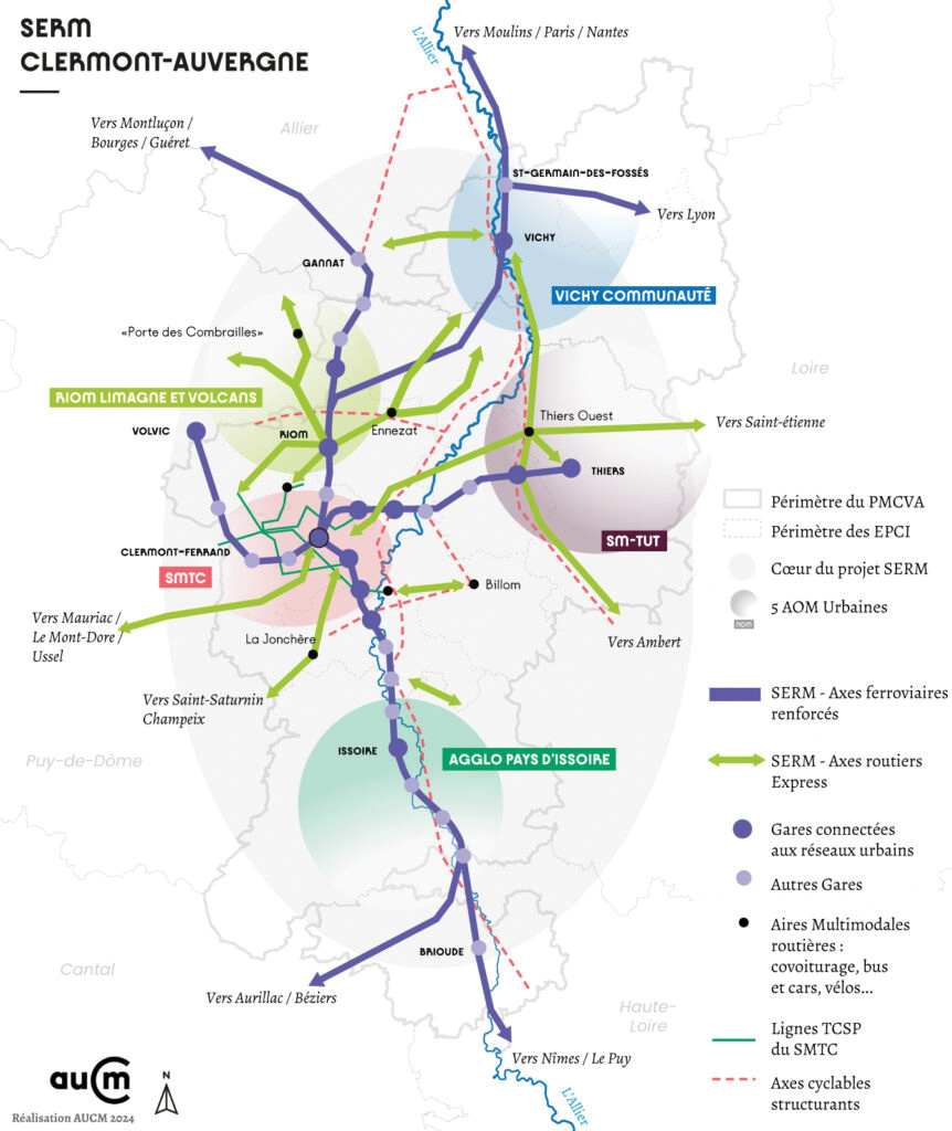 Le projet de SERM rapproche la Région, l’État et les 5 Autorités Organisatrices de Mobilité (AOM) locales. Depuis 2018, les différentes Autorités Organisatrices (AO) – Roanne, Vichy, Thiers, Issoire, Clermont-Ferrand – se réunissent 3 à 4 fois par an pour discuter des préoccupations communes en matière de mobilité, qui concernent les enjeux économiques liés aux bassins d’emploi. Le SERM de Clermont-Ferrand se veut donc véritablement multi-acteurs afin de porter un message fort : le SERM n’est pas un objet unique, et celui du Clermontois doit être différent des autres. Par ailleurs, aucun signataire ne tient le rôle de tête de file du projet et tous participent au même niveau à toutes les réflexions (cars, trains, intermodalité, billettique) ; les missions sont réparties selon les compétences de chacun.