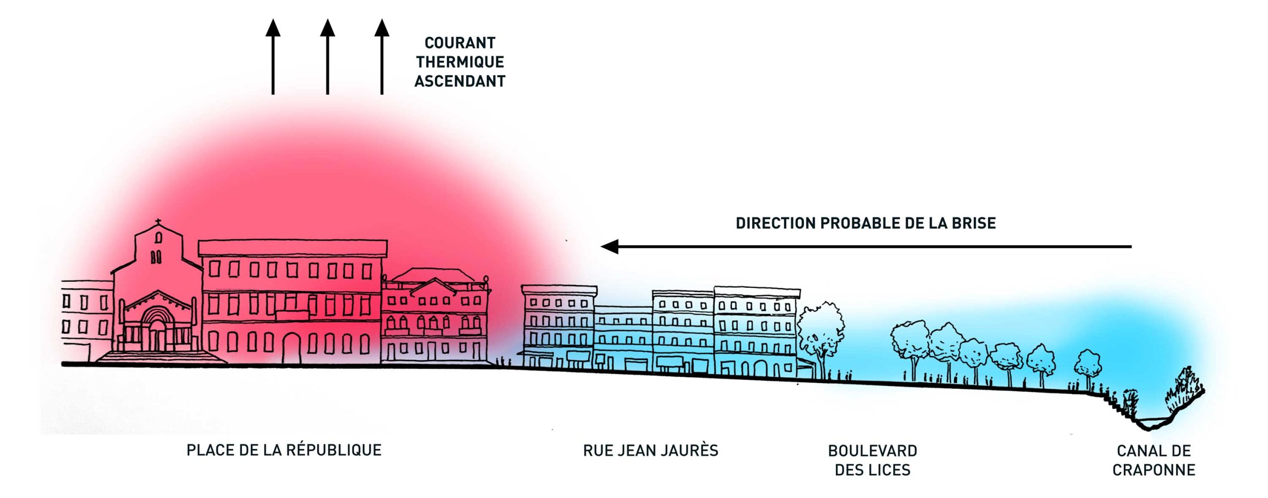 Aujourd’hui, le vent peut devenir un levier de rafraîchissement pour la ville, en particulier celui du sud. En effet, l’une des pistes envisagées par le groupe d’experts consiste à installer une fontaine, au sud du centre historique, afin que la fraîcheur produite soit portée par le flux d’air et diffusée dans l’ensemble du centre-ville. L’ouverture du canal de Craponne pourrait également amplifier ces apports de fraîcheur. Ainsi, en combinant point de fraîcheur et points chauds dans la ville, il devient envisageable de créer des brises selon Clément Gaillard. Un projet à la fois innovant et ambitieux qui fait actuellement l’objet de réflexions et de discussions budgétaires.