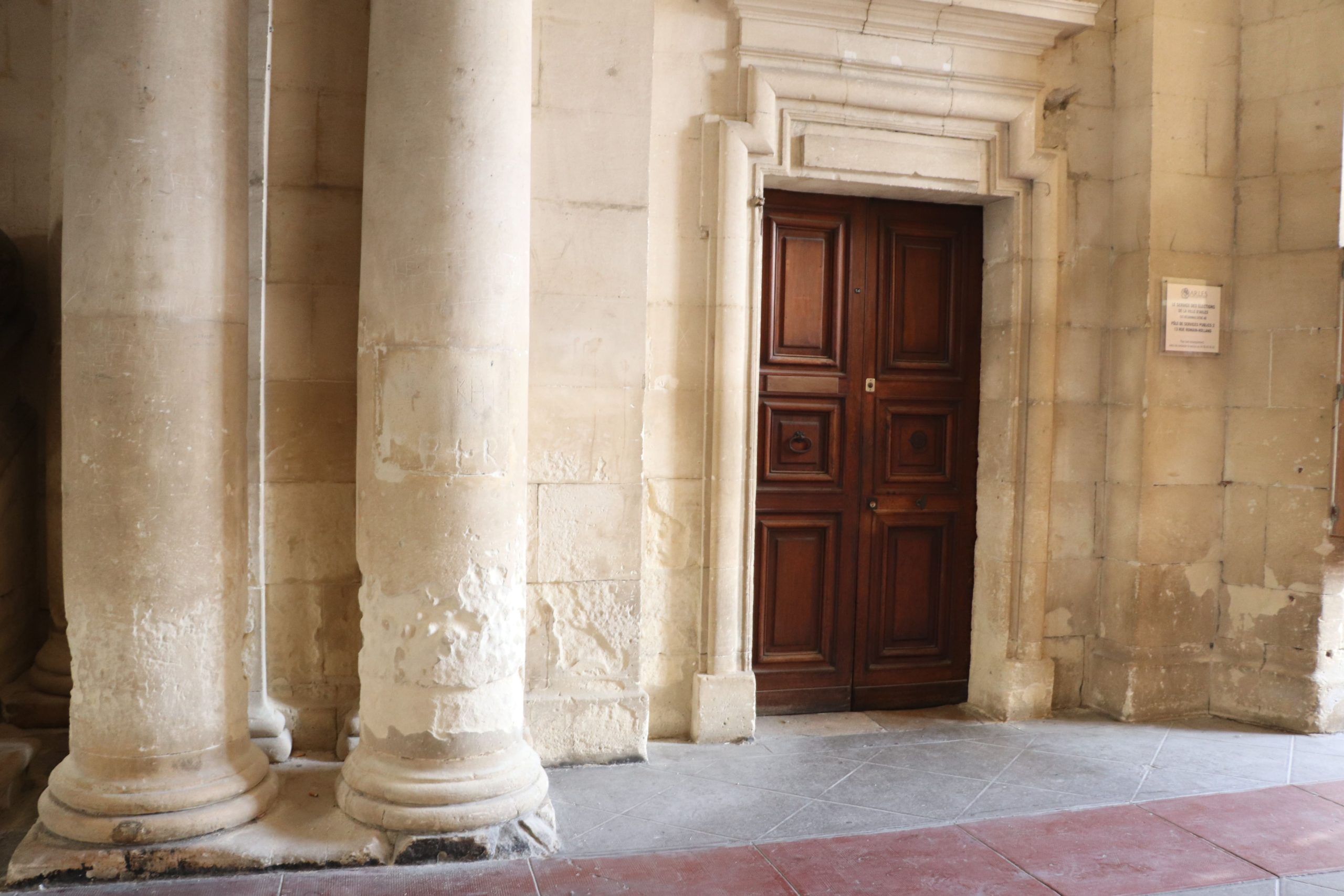Alors que les exigences du patrimoine freinent son adaptation, les activités humaines affectent et mettent directement ce patrimoine en danger, et cela ne se limite pas aux enjeux climatiques. Certains lieux du patrimoine historique d’Arles sont menacés par les conséquences de l’artificialisation des sols, comme la voûte au rez-de-chaussée de l’Hôtel de ville. Les surfaces alentour étant particulièrement étanches, réalisées en béton de ciment ou bitumineux, voire en asphalte, l’eau stockée dans les sols ne peut plus s’évaporer qu’en cheminant par les parois de maçonnerie. Dans le vestibule de l’Hôtel de Ville (cf. photo ci-dessous), on aperçoit des colonnes en calcaire altérées par l’eau qui cherche à s’échapper des sols. D’après Jean-Marc Bernard, ancien responsable des travaux dans les secteurs sauvegardés de la ville d’Arles, la solution la plus durable est de rendre sa perméabilité au sol là où cela ne gêne pas les fonctions urbaines. De plus, cela permettrait de récupérer de la fraîcheur grâce à cette eau évaporée : un sol perméable associé à un fort ensoleillement favorise naturellement la sensation de fraîcheur.