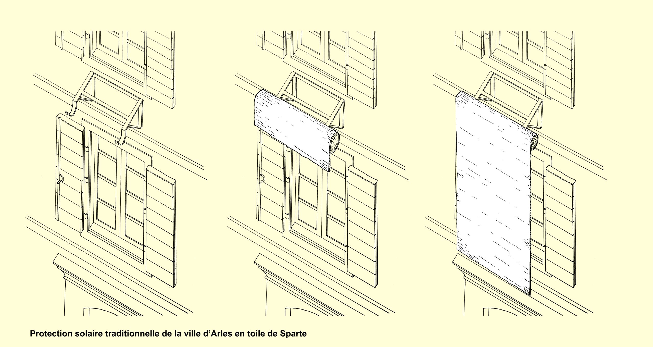 Les voiles d’ombrage ont longtemps fait partie du paysage des villes du Sud, à Arles comme à Séville, Avignon ou Nîmes. En effet, avant l’invention de la climatisation, la protection contre le soleil primait sur la stratégie de rafraîchissement active. Les pratiques et savoir-faire anciens pour s’adapter à la chaleur étaient discrets, mais il s’agit là d’un véritable patrimoine à se réapproprier pour rafraîchir la ville intelligemment, de façon durable et peu coûteuse. Ces techniques prenaient des formes variées : l’une étant de recouvrir les marquises en fer des boutiques de tissus pour créer de l’ombre à l’intérieur des magasins. Utiles dans la journée pour empêcher la chaleur de s’accumuler, ces voiles d’ombrage étaient retirés la nuit pour laisser la chaleur se dissiper.