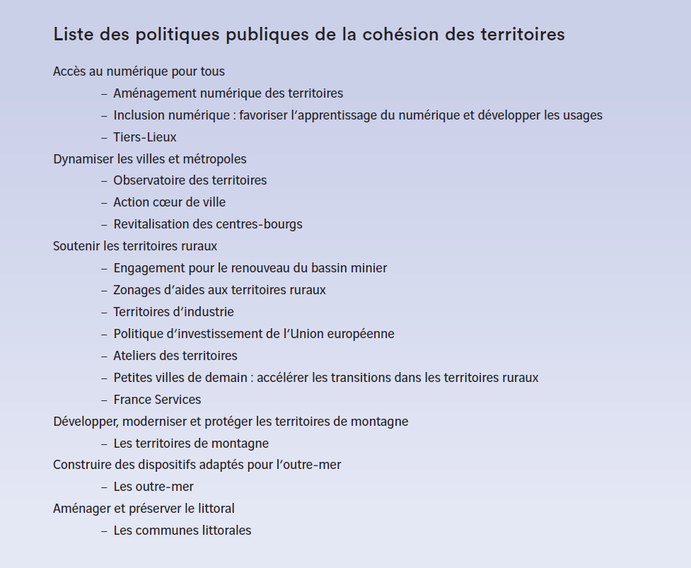 Le ministère de l’Aménagement du territoire et de la Décentralisation (juin 2024) propose une découverte des « politiques publiques déployées dans [les] territoires. Numérique, ville, ruralité, montage, littoral… », dont la maquette est reprise dans l’encadré ci-dessous18.