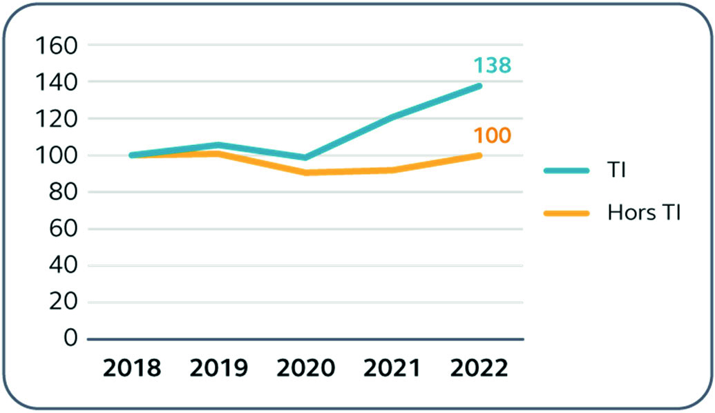 Selon qu’une entreprise industrielle était dans un Territoire d’industrie ou pas, sa valeur ajoutée moyenne (entre 2018 et 2022) s’était accrue de +40 % (38 % exactement) ou bien était restée stable.