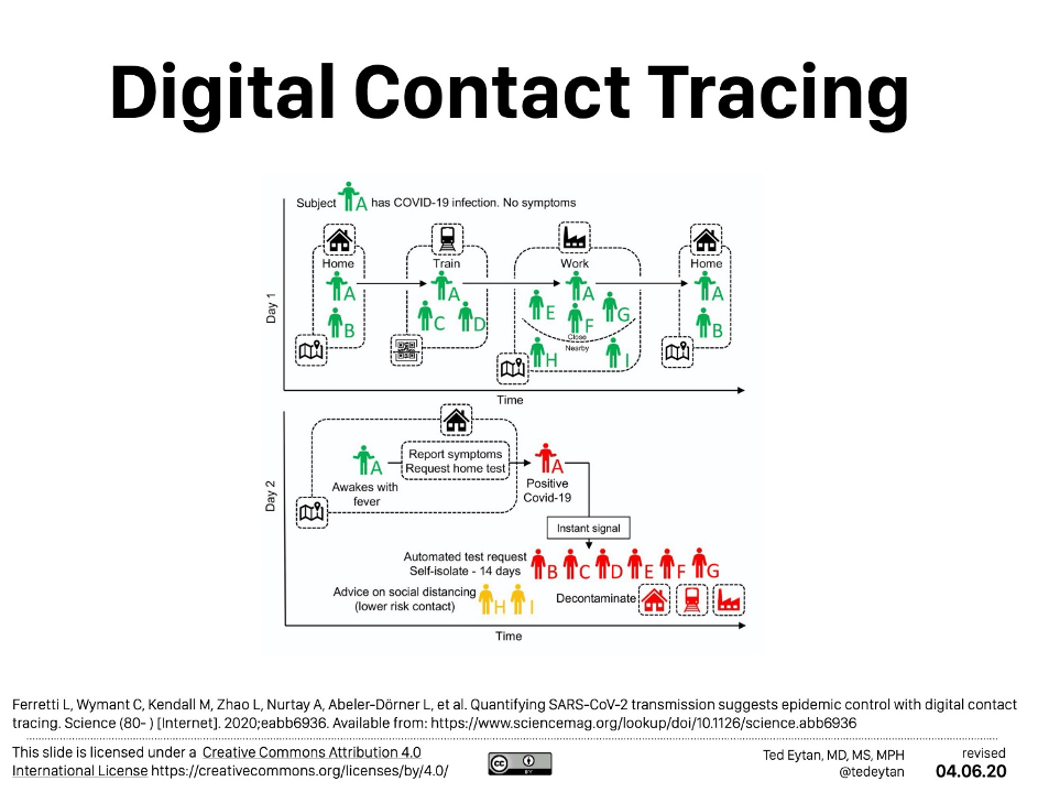 Pour la Chine, la Corée ou Singapour, la fin du confinement ou le choix de ne pas confiner la population sont assortis de mesures de contrôle de l’état de santé de chacun, essentiellement grâce au « contact tracing ». Cette méthode, utilisée efficacement lors d’autres épidémies telles que celle d’Ebola, consiste à rechercher de façon systématique tous ceux ayant pu être en contact avec un malade à partir du moment où il était contagieux, même s’il ne présentait pas encore de symptôme. Le but est de réussir à casser la chaîne de dissémination de la maladie en prévenant les personnes concernées du risque de contamination et en les isolant éventuellement. Cette recherche de contacts peut s’effectuer par enquête, mais représente un travail long, relativement peu efficace, voire impossible dès que les cas se multiplient.